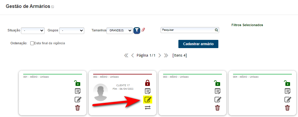 2. Logo será apresentada a tela com todos os armários cadastrados na empresa. Localize o armário que deseja editar o nome, e clique no ícone ;