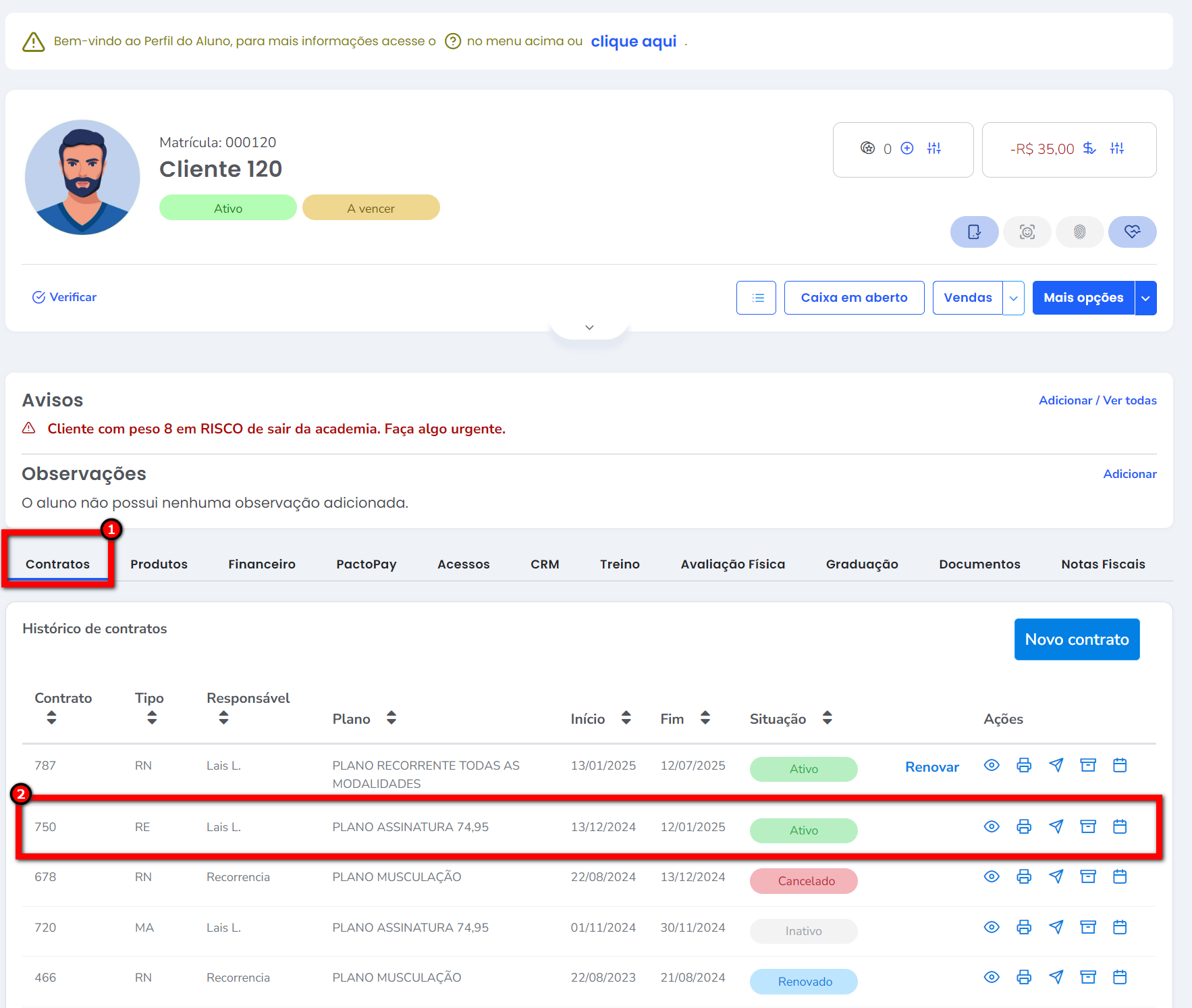 1. Acesse o perfil do Aluno no módulo ADM, e clique no contrato vigente dele;
