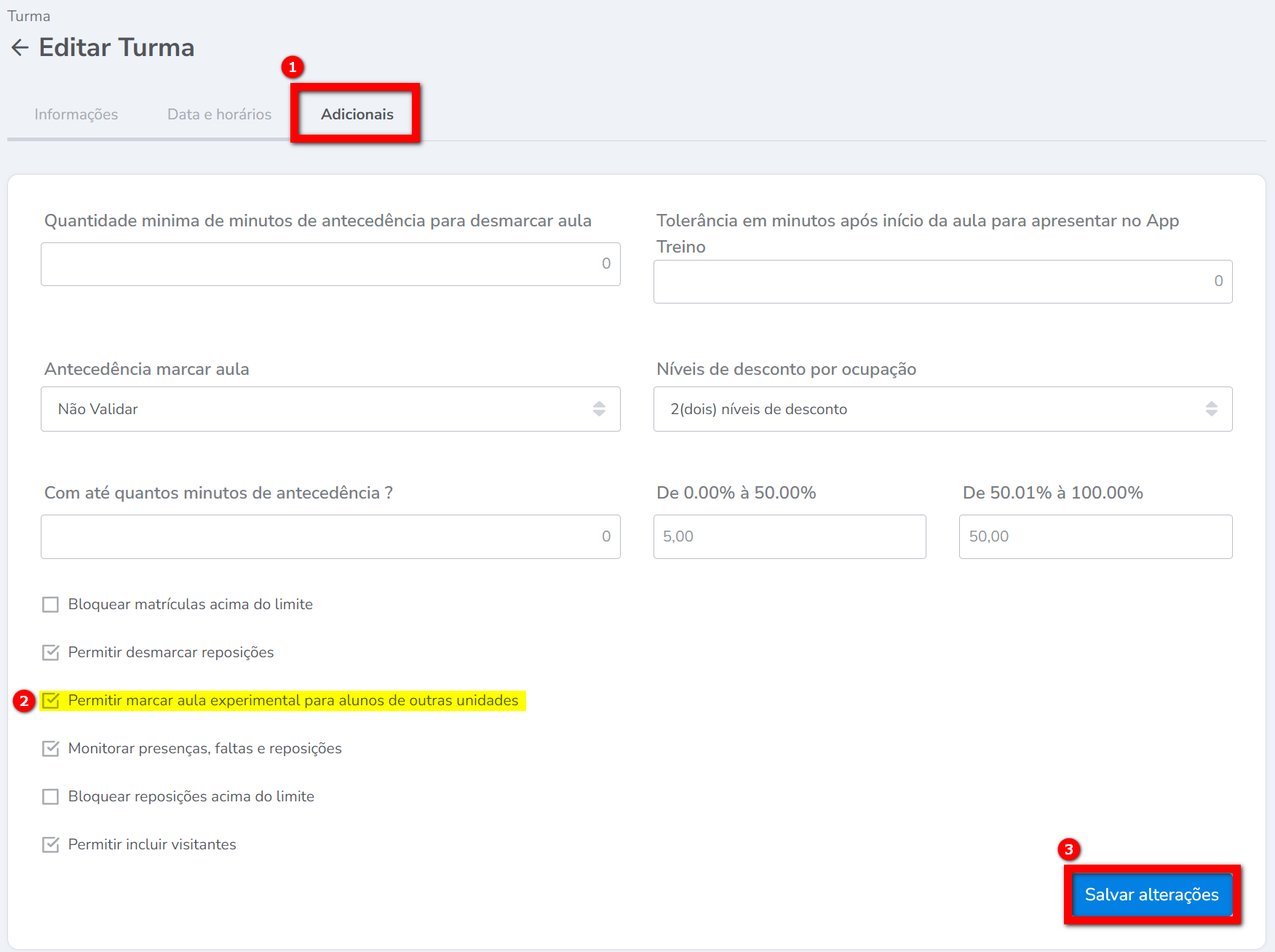 2. Após localizar a turma, vá até a aba “Adicionais“, selecione a opção “Permite marcar aula experimental para alunos de outras unidades” e clique em “Salvar alterações“. Uma vez configurada essa opção, o sistema permitirá o agendamento de alunos de outras unidades para essa turma específica que você configurou;