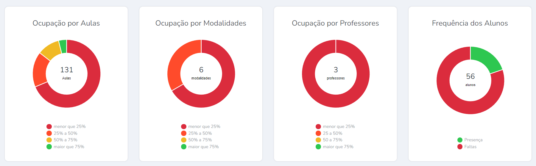 Por exemplo: a aula de Dança acontece nos horários das 08:00 às 09:00 e também das 13:00 às 14:00, o sistema vai gerar um relatório individual de quantos alunos participaram em cada horário. Além disso, é exibido uma porcentagem de ocupação, com base na capacidade de alunos por aula.
