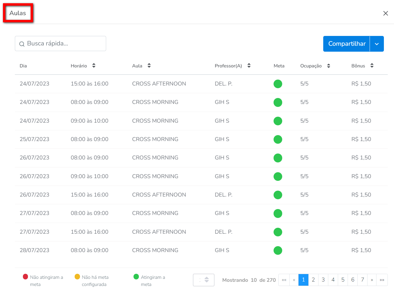 - Ocupação média: neste campo é exibido a porcentagem de ocupação necessária, configurada nas aula coletivas, para receberem a bonificação. Clicando sobre a porcentagem é apresentada uma listagem com todas as aulas configuradas para bonificação;