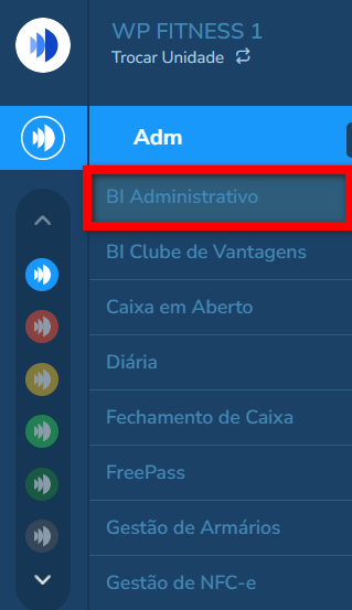 1. No módulo ADM, no menu lateral esquerdo clique em “BI Administrativo“;