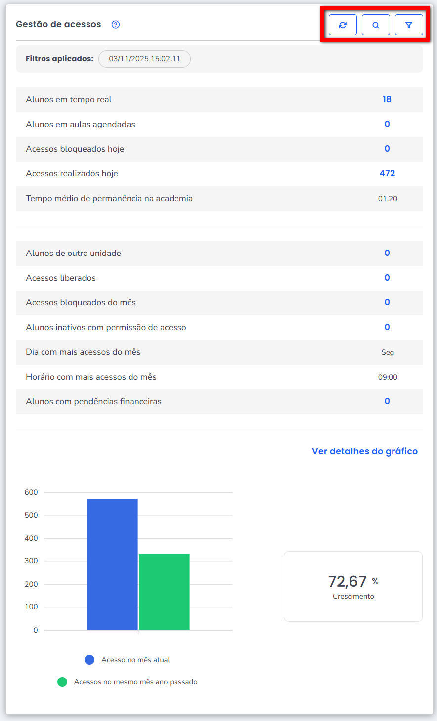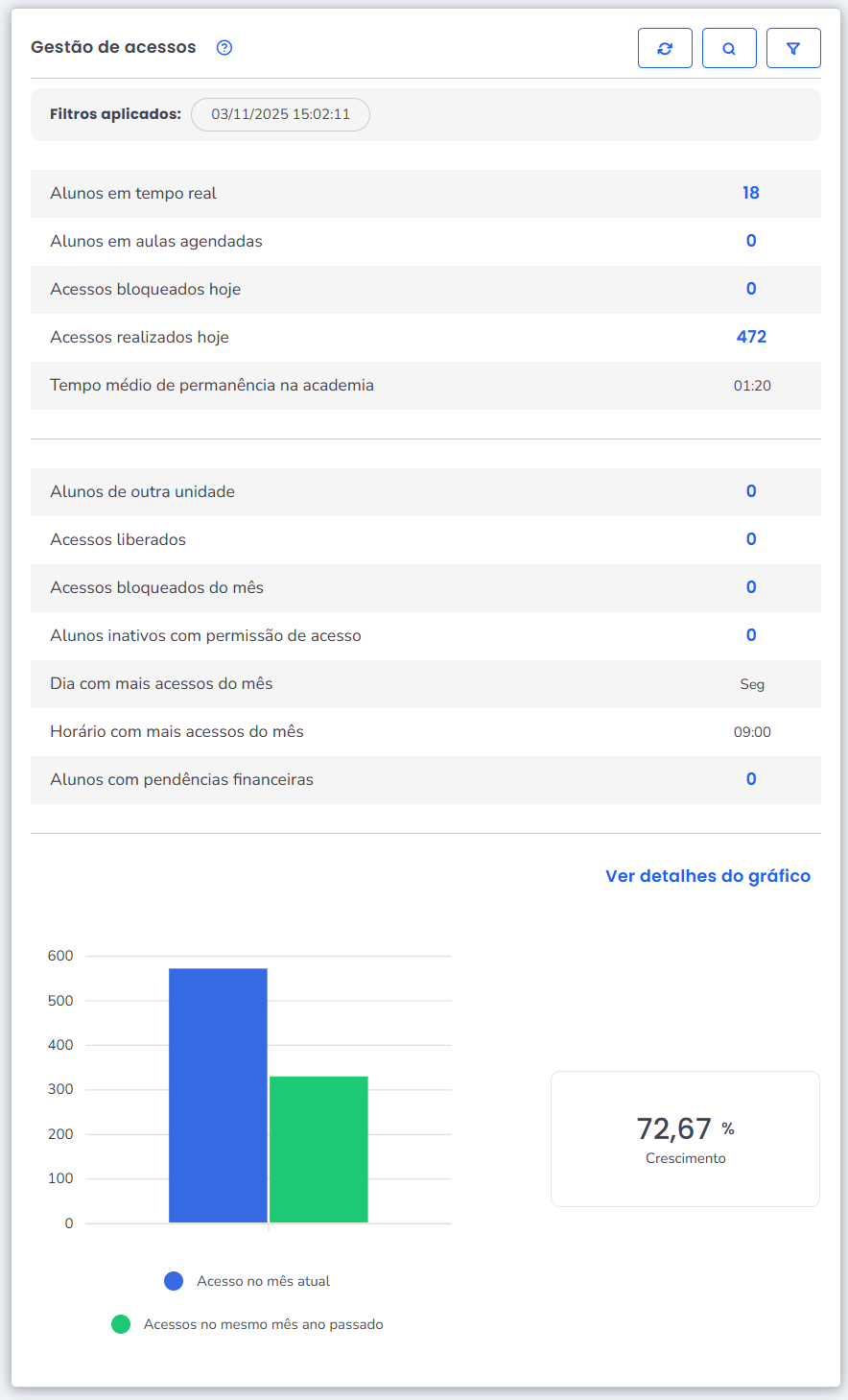- Acessos bloqueados hoje: este indicador apresenta todos os alunos que tentaram acessar a catraca da empresa no dia, porém estão com o acesso bloqueado;
