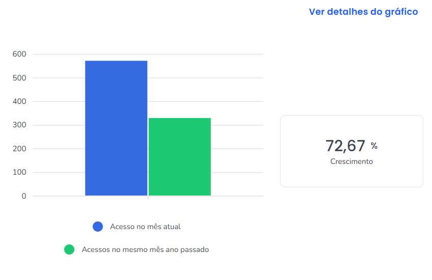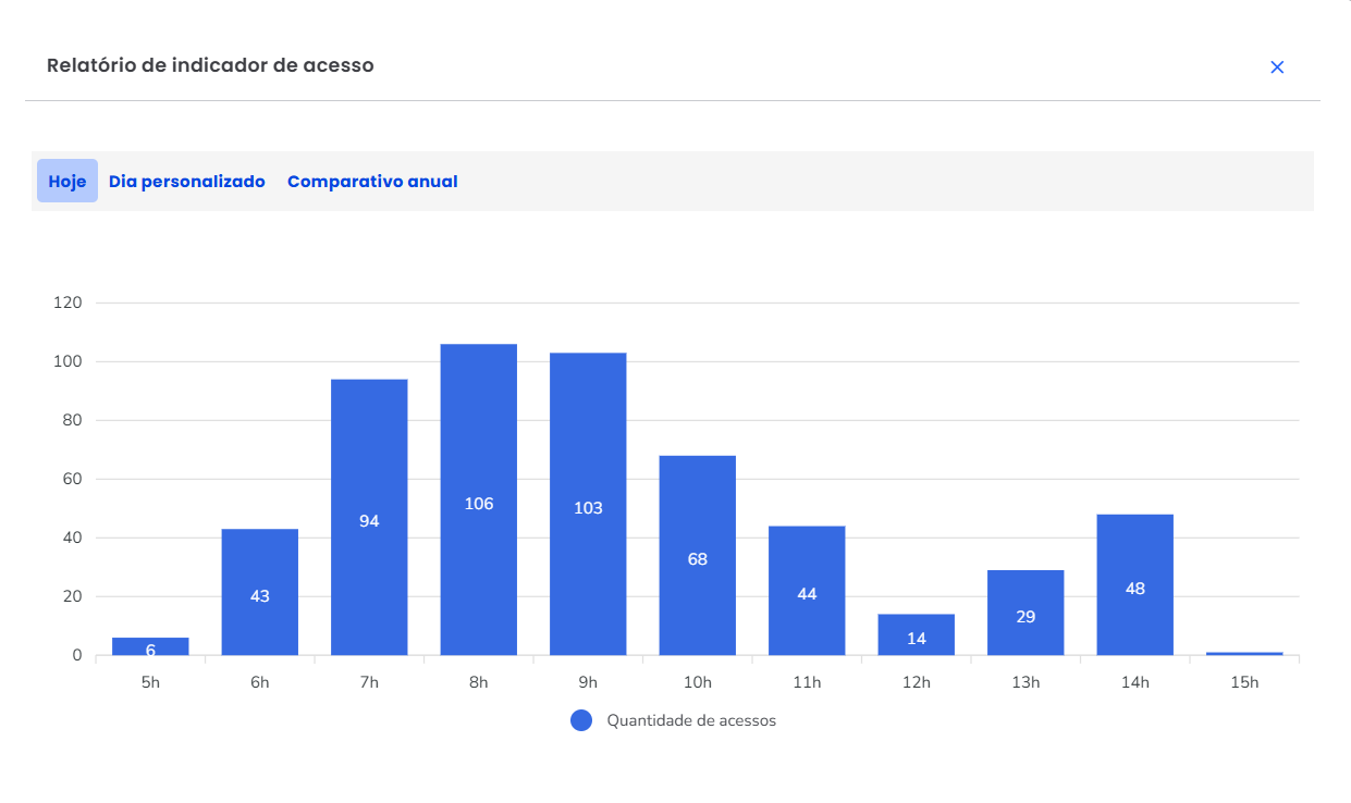 Ao clicar em “Ver detalhes do gráfico” você terá acesso ao Relatório Indicador de Acessos, e assim conseguirá visualizar com maiores detalhes os acessos da sua empresa. Ainda será possível aplicar filtros de período, podendo escolher entre o dia de hoje, um outro dia ou um comparativo anual.