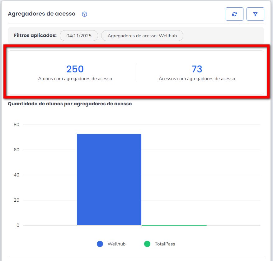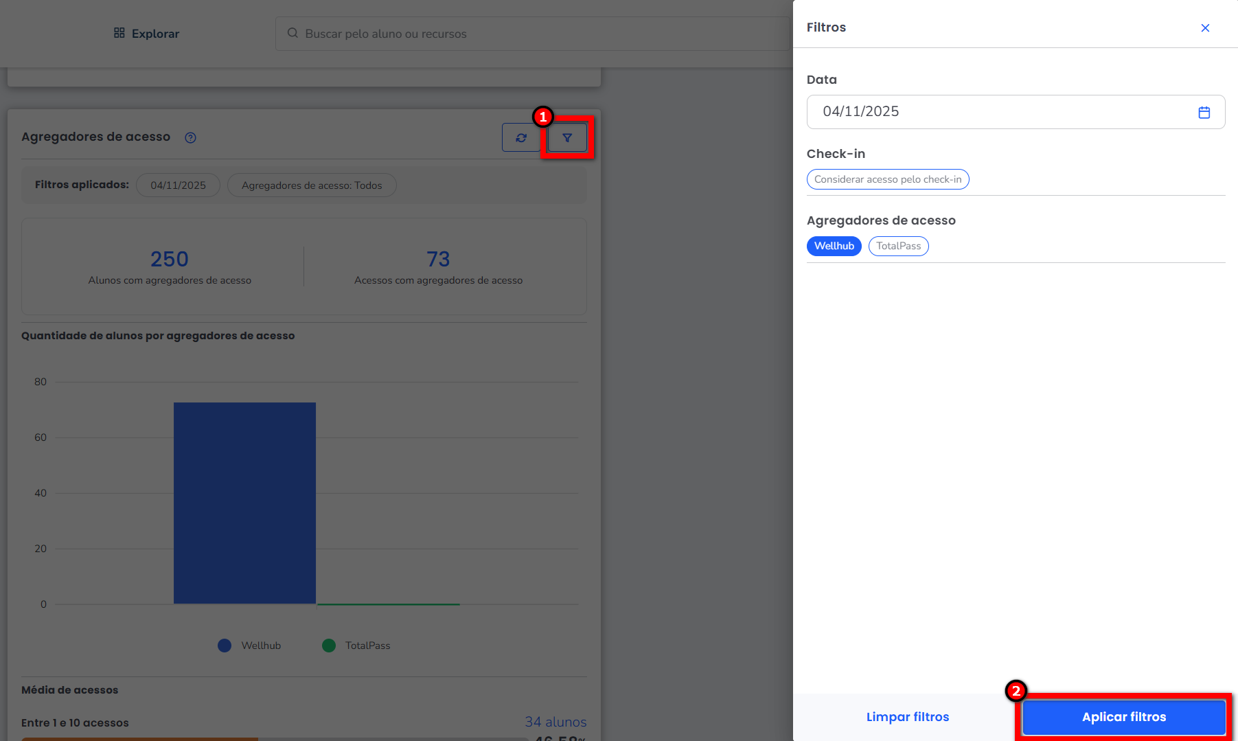 - Agregadores de acesso: selecione se deseja visualizar somente alunos da Wellhub ou somente alunos da TotalPass de acordo com as integrações de acesso que tiver configurada na empresa.