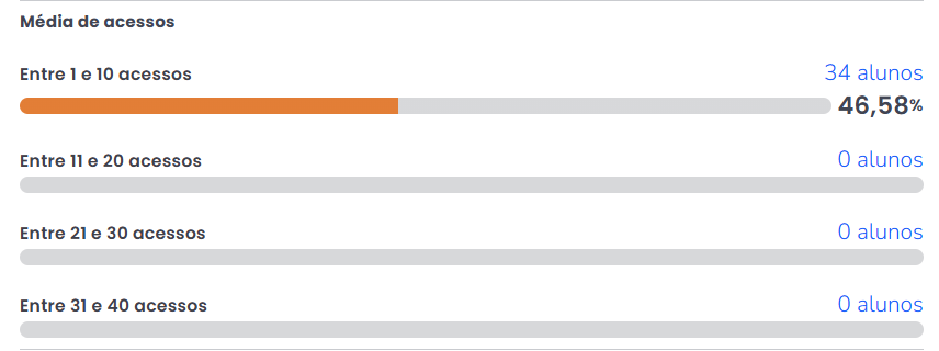 Por exemplo: na imagem abaixo entre 1 e 10 acessos temos 34 alunos, o que totaliza 46,58 porcento do total de acessos pelos agregadores.
