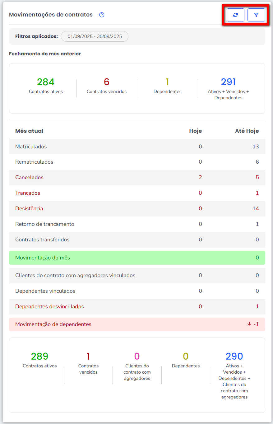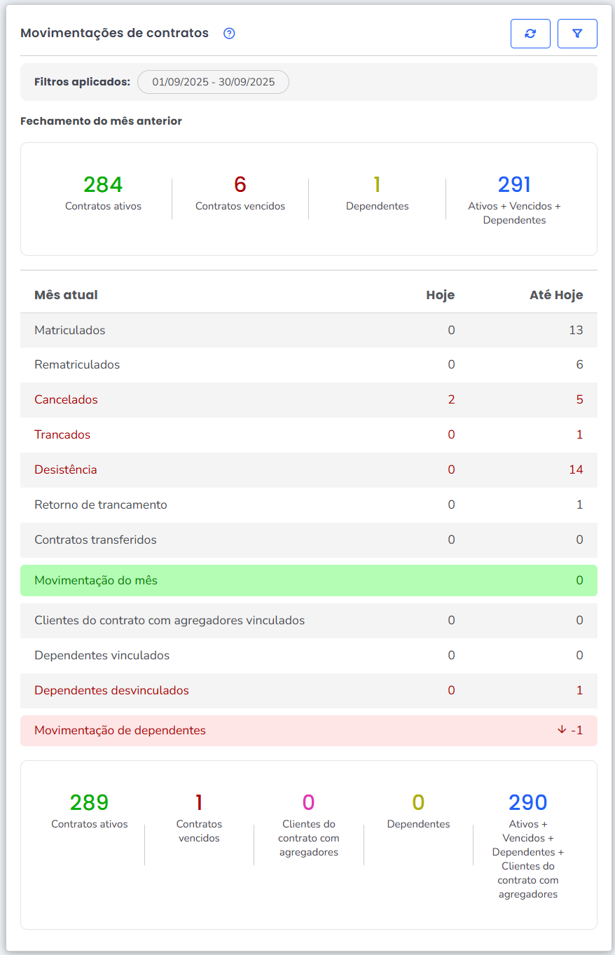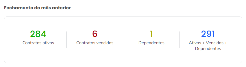 Assim como o Fechamento do Mês Anterior, este campo mostra o total de contratos ativos, vencidos, agregadores e dependentes da data atual de análise.