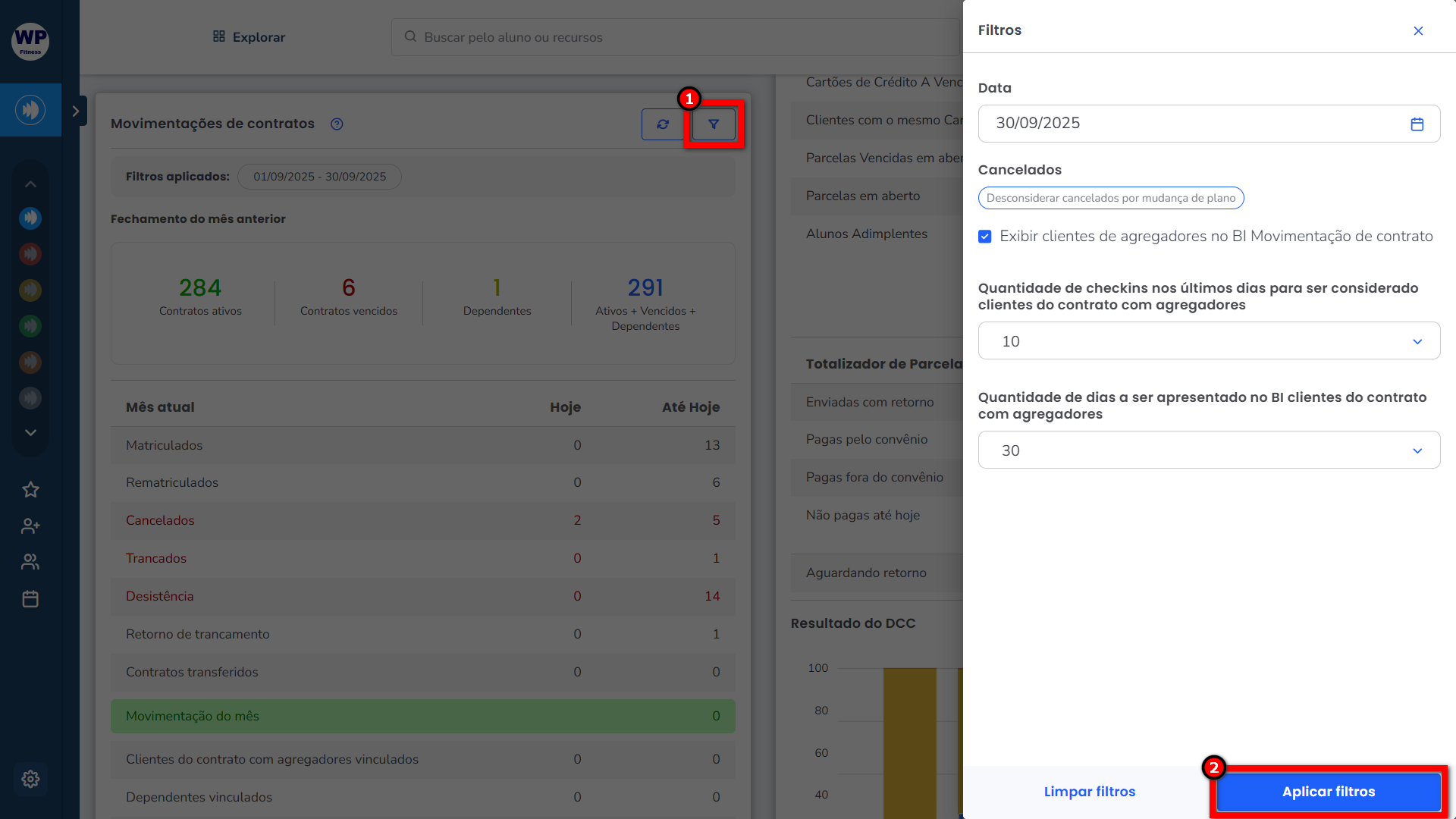 - Exibir clientes de agregadores no BI Movimentação de contrato: marcando esta opção, nos indicadores “Clientes do contrato com agregadores vinculados” e “Clientes do contrato com agregadores” serão contabilizados os alunos que utilizam, Wellhub, GoGood ou TotalPass;