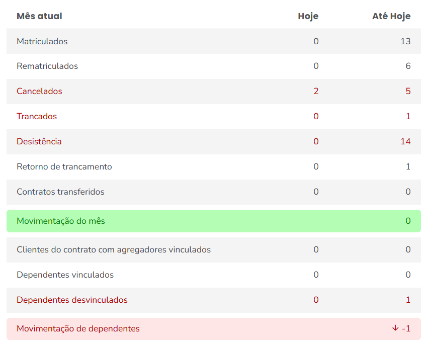 É o saldo dos contratos com dependentes do mês atual, até a presente data. Se a empresa utiliza plano com dependentes, aqui será apresentado o resultado de acordo com a quantidade de dependentes vinculados, e a quantidade de dependentes desvinculados.