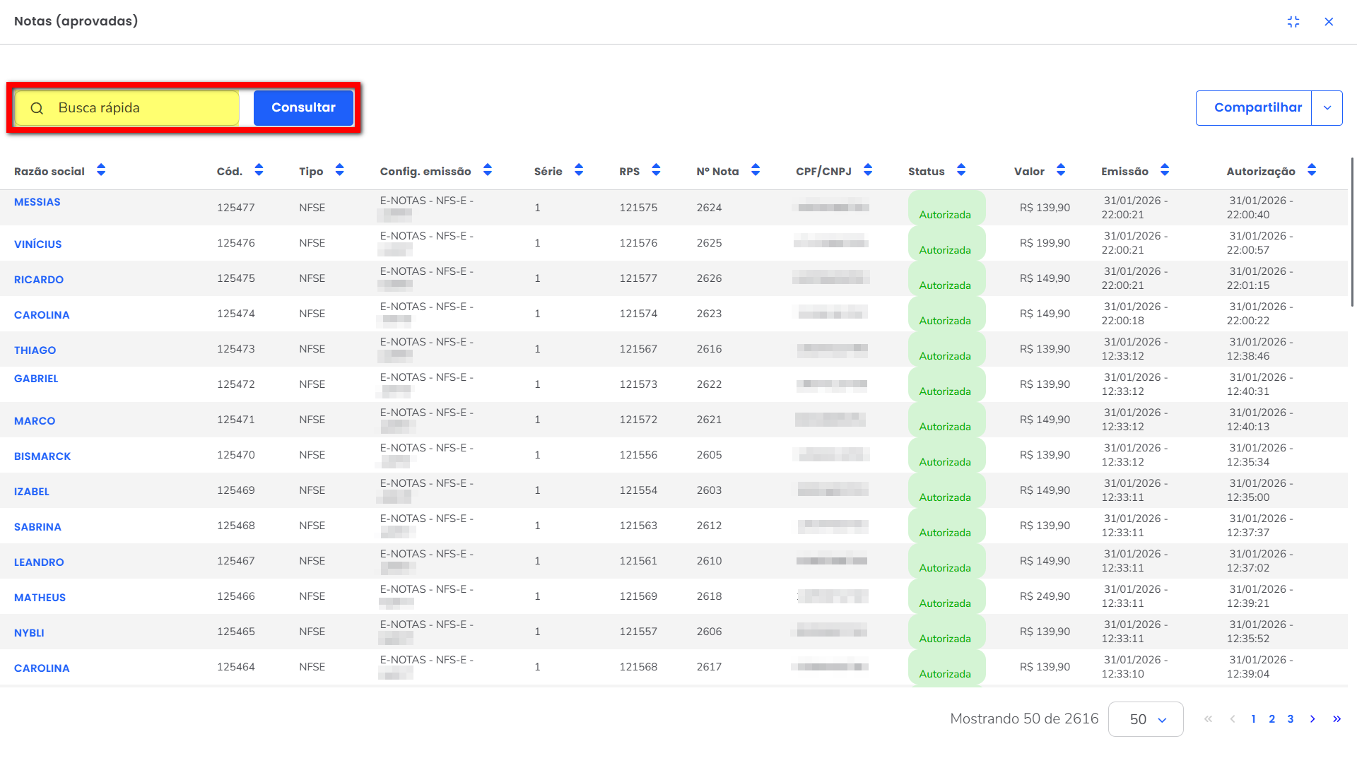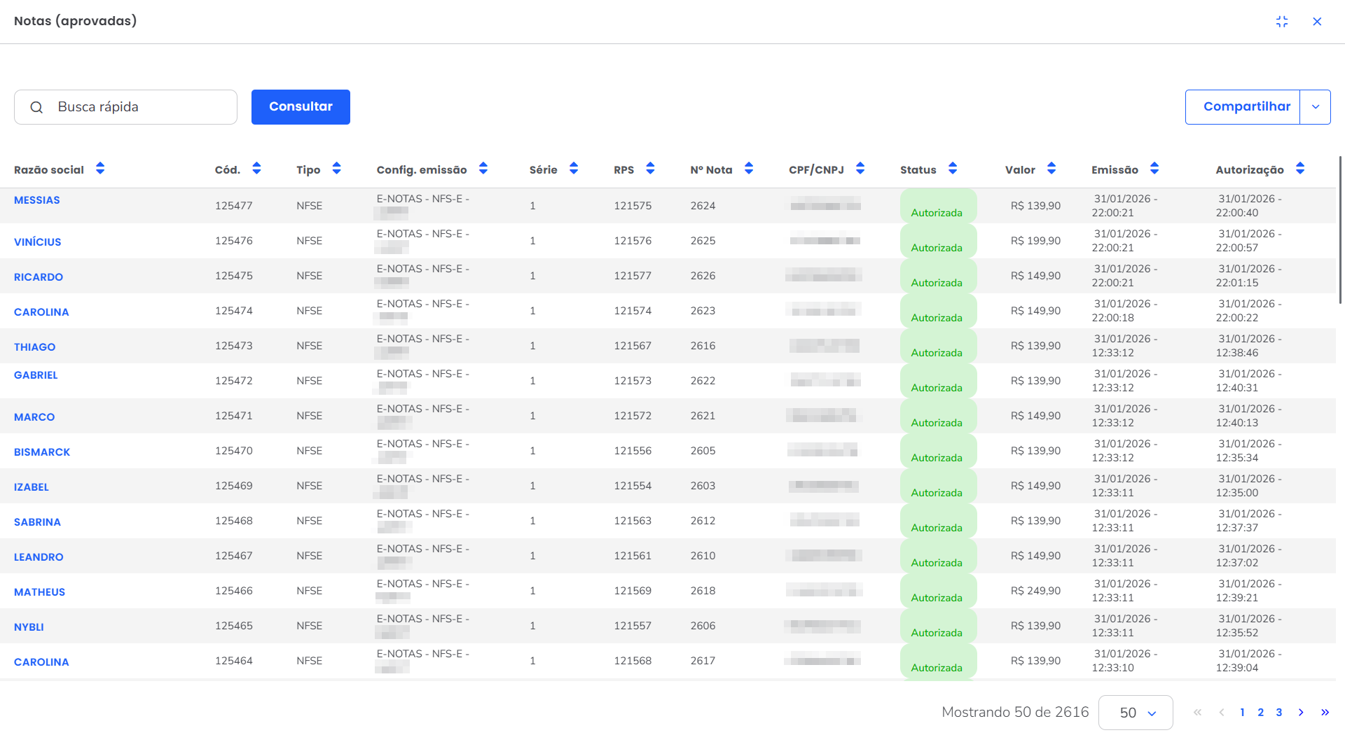 - Razão social: nome da empresa ou do cliente vinculado à nota fiscal;