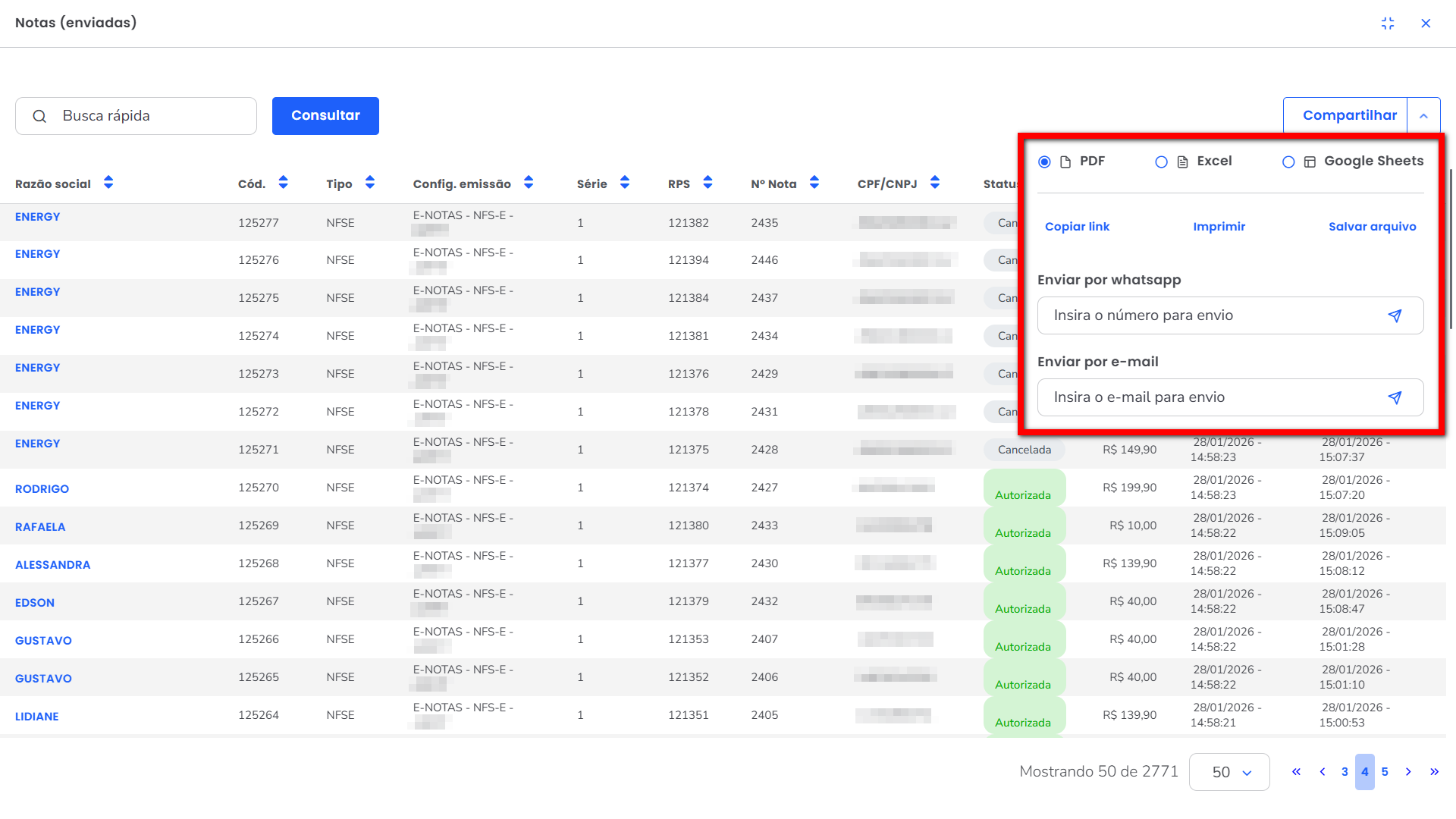 - Autorização: data e hora da autorização da nota fiscal pela SEFAZ ou prefeitura.