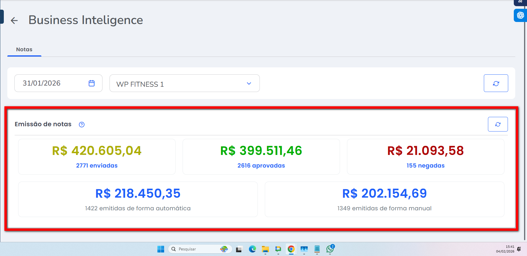 - Emitidas de forma automática: apresenta a quantidade de notas fiscais emitidas por rotinas automáticas configuradas no sistema, como emissão agendada ou integração com gateway fiscal;