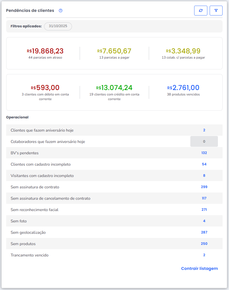 2. Ao carregar a tela, localize o BI “Pendências de Clientes“;