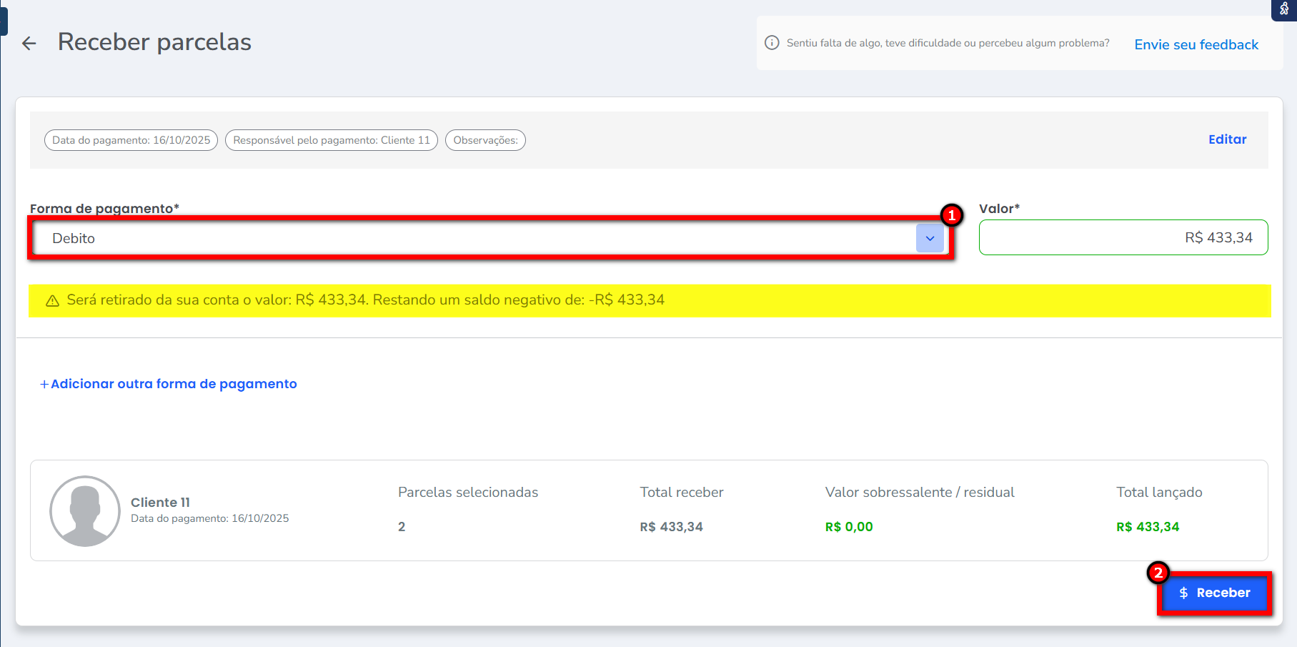 4.3. Caso o aluno não possua o valor total para o pagamento, é possível registrar o valor como crédito negativo em sua conta corrente. Dessa forma, o valor sai do caixa em aberto, mas permanece como pendência no perfil do aluno até que ele realize o pagamento. Para isso, selecione a forma de pagamento “Débito”.