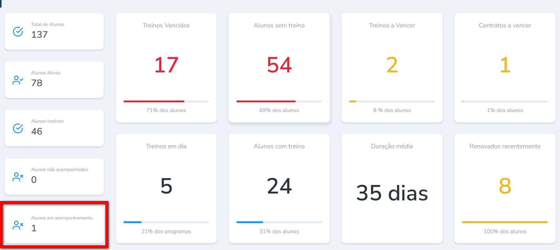 O recurso de acompanhar permite que o professor forneça assistência aos alunos durante seus treinos e informe no sistema que este aluno está em acompanhamento.