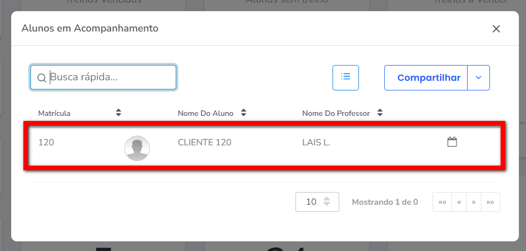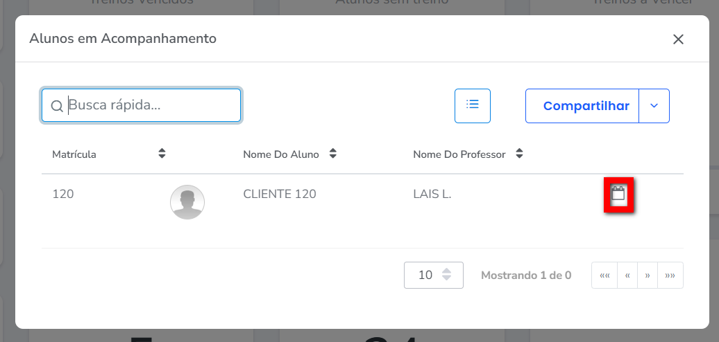 3. Localize o aluno que deseja iniciar o acompanhamento. Clique no ícone de Calendário para iniciar o acompanhamento do treino;