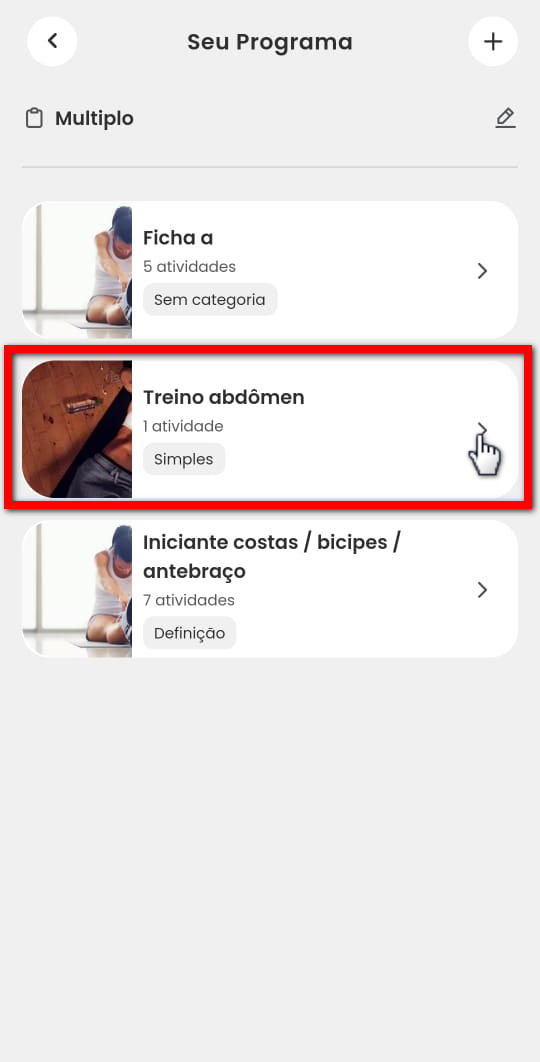 4. Nesta tela são exibidas as fichas de treino adicionadas no programa de treino, localize a ficha desejada e clique sobre ela;