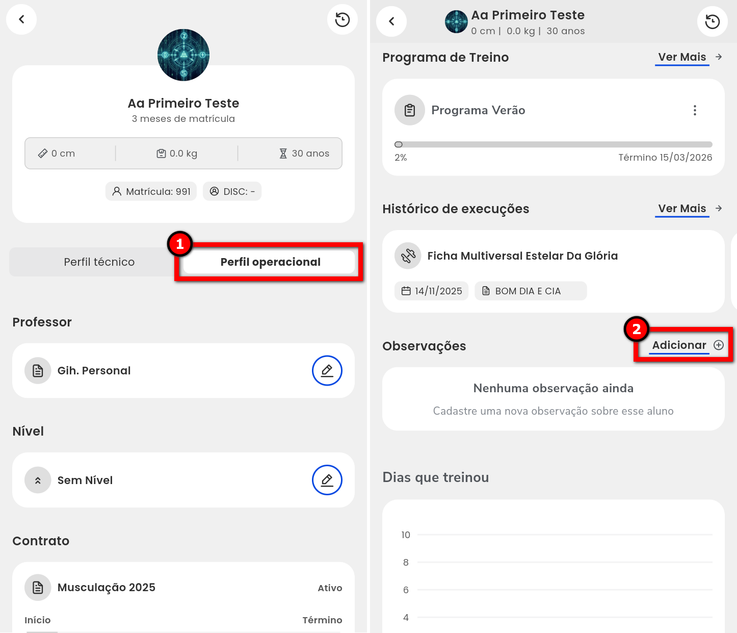 Em algumas situações, pode ser necessário adicionar ou remover uma observação no perfil do aluno. Essa ação pode ser feita facilmente pelo colaborador diretamente no App Treino.