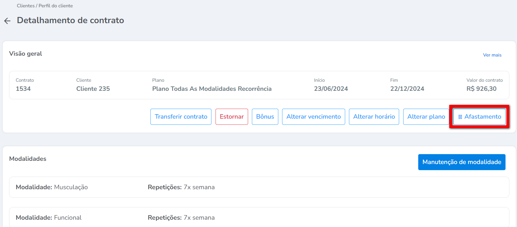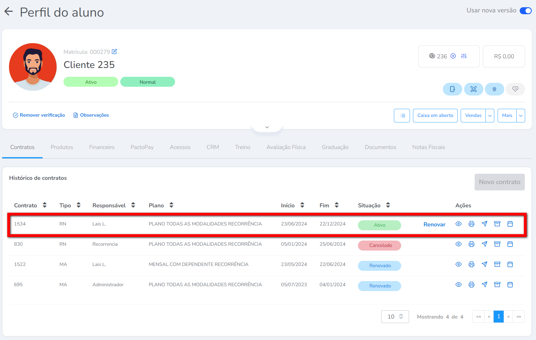 1. Acesse o perfil do aluno desejado e clique sobre o contrato que será trancado;