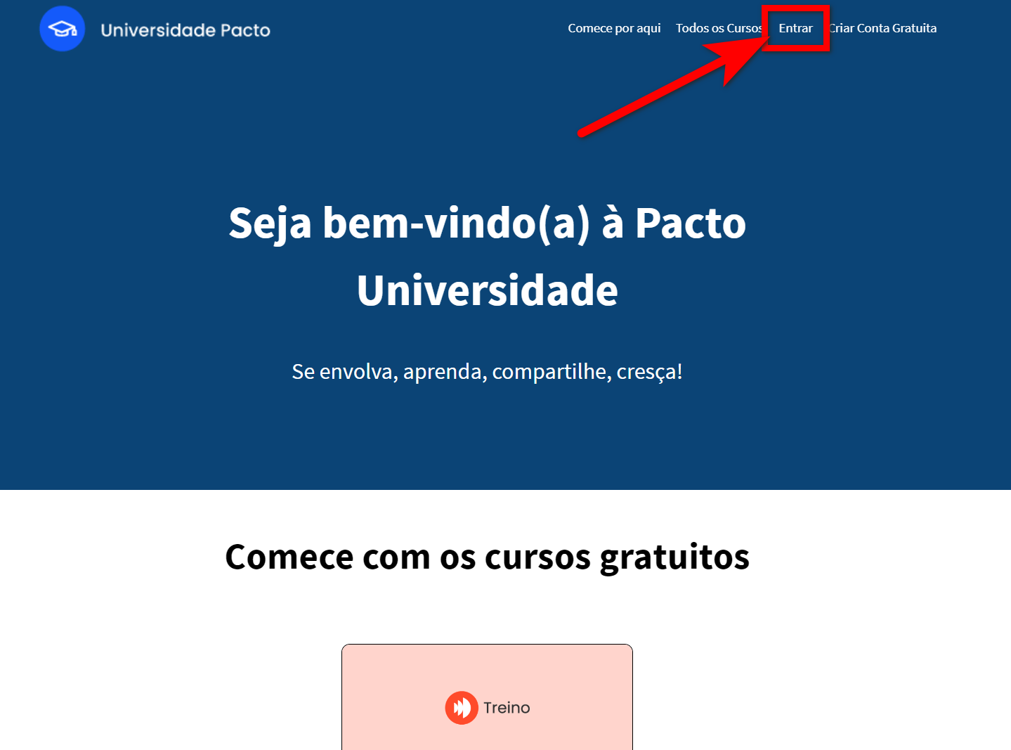 1. Ao acessar a Universidade Pacto e clique em “Entrar“;
