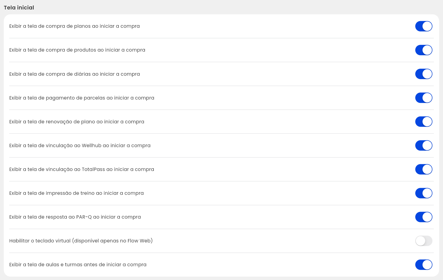 2.6. Em “Tela inicial“, habilite as configurações que você deseja que sejam exibidas na tela de seleção do Pacto Flow;