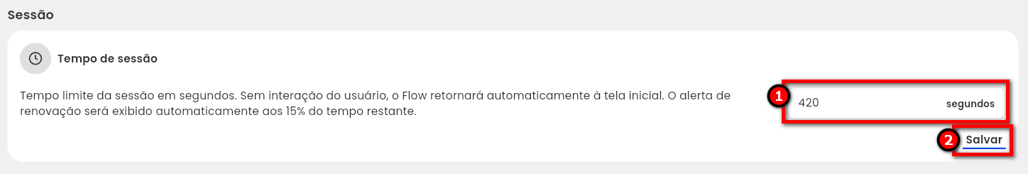 2.7. Em “Sessão“, é possível definir um tempo limite para que a sessão do aluno permaneça ativa. Após esse período, o Pacto Flow retorna automaticamente para a tela inicial, encerrando a sessão do aluno conectado e permitindo um novo acesso.