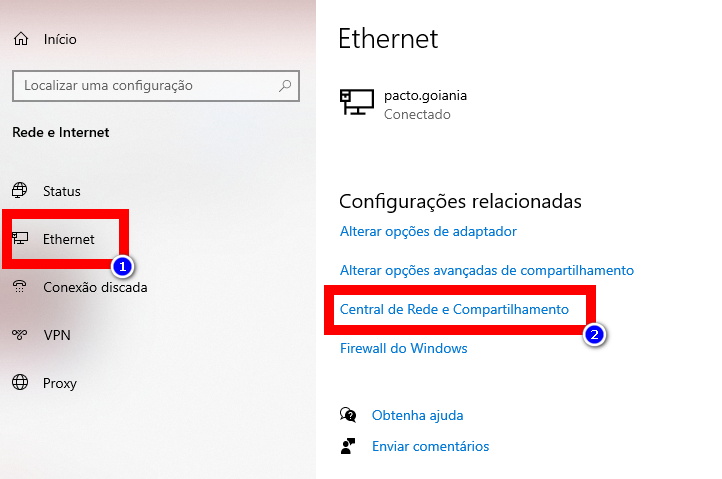 3. Clique em “Ethernet” e após, clique em “Central de Rede e Compartilhamento”;