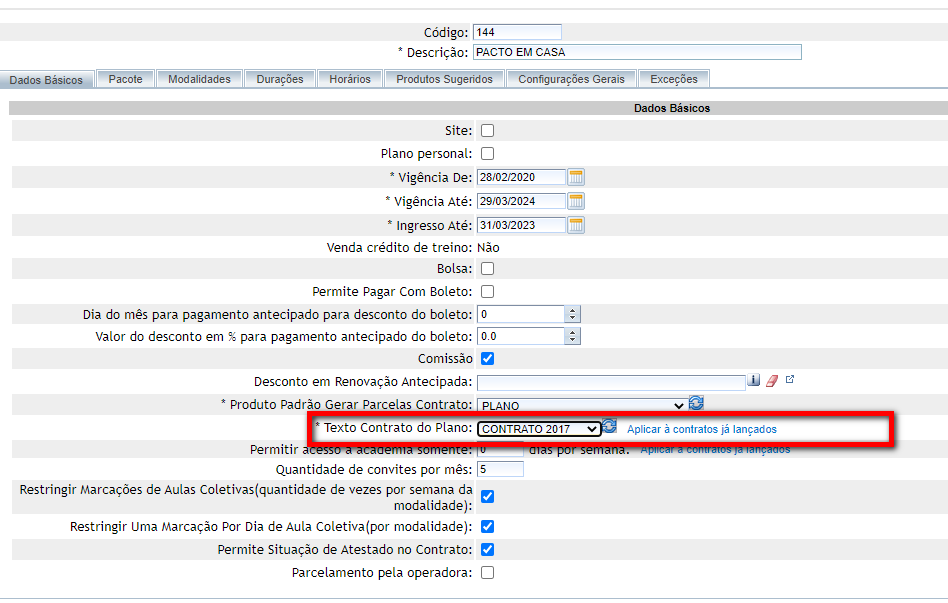 Observação: a operação de aplicar o modelo de contrato para planos já lançados só é possível na tela antiga de plano.