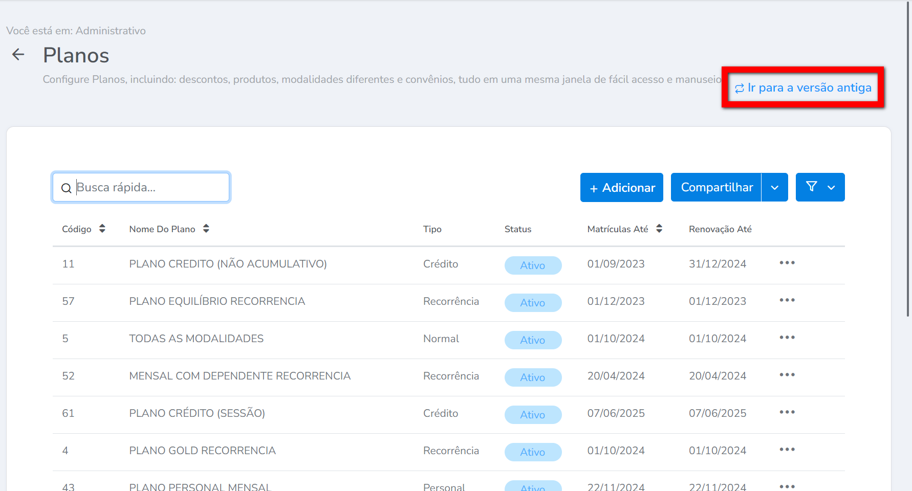 2. O sistema direcionará para uma nova tela listando todos os planos cadastrados, clique no botão “Ir para a versão antiga“;