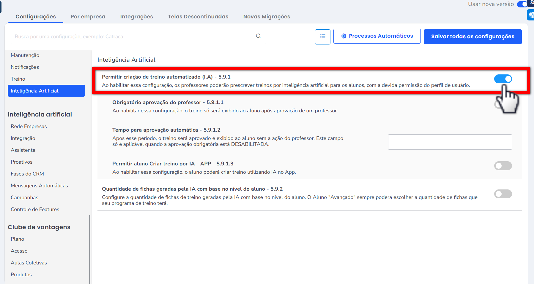 3. Habilite a configuração “Permitir a criação de treino automatizado (I.A)“;