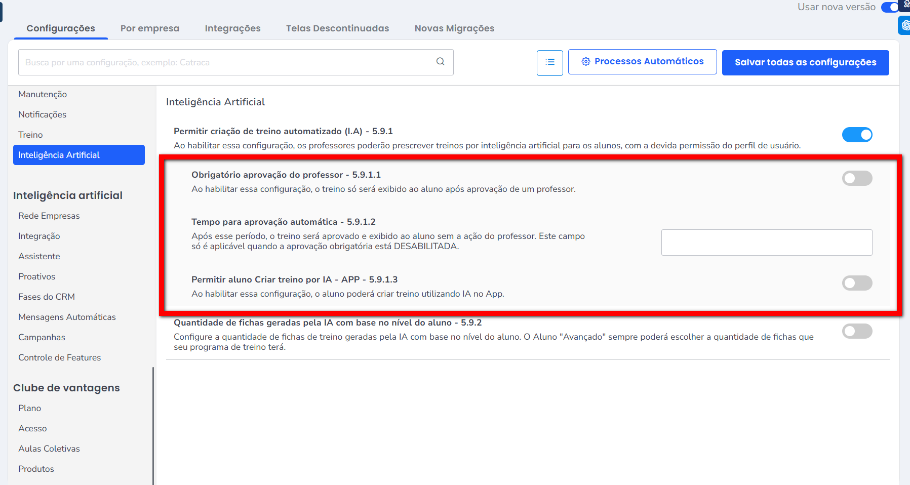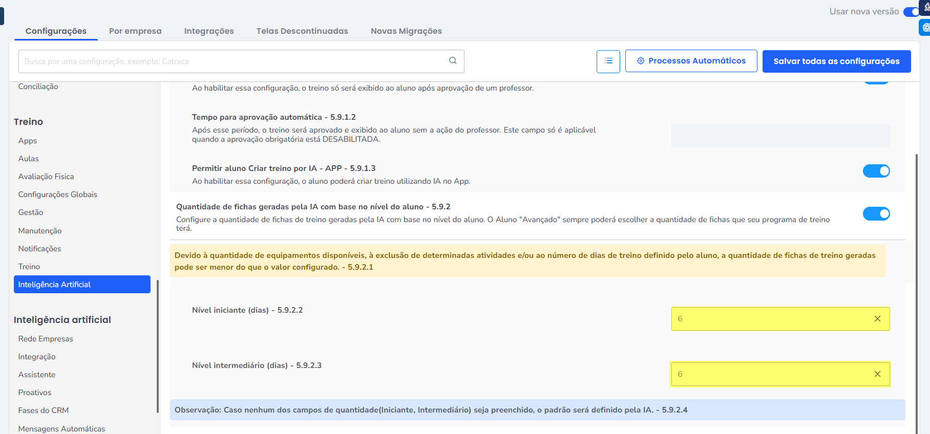 3.1. Após selecionar a opção “Permitir criação de treino automatizado (IA)” serão liberadas mais três configurações, que devem ser realizadas.