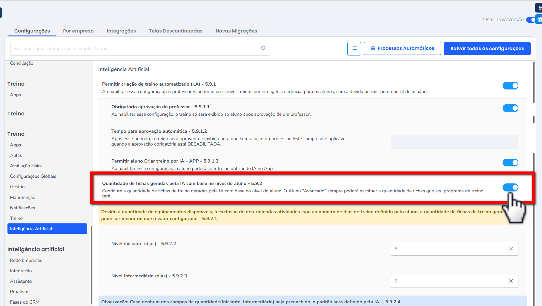 4. Se desejar definir a quantidade de fichas de treino que será criada com base no nível de treino do aluno, ative a configuração “Quantidade de fichas geradas pela IA com base no nível do aluno“;