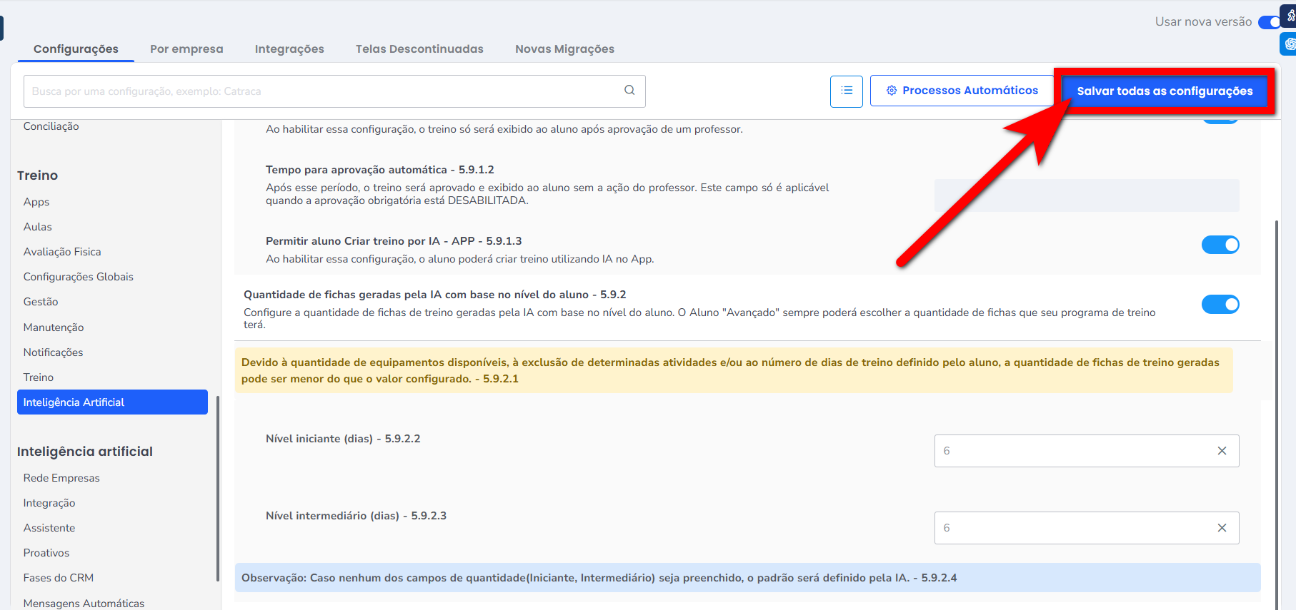 - Quantidade de fichas geradas pela IA com base no nível do aluno: configure até quantas fichas de treino a Inteligência Artificial deve gerar de acordo com o nível do aluno, permitindo personalizar a prescrição.