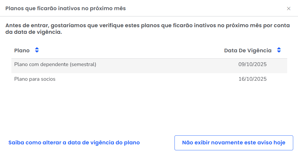 Dica: se algum plano não deve ficar inativo, acesse o cadastro do plano e altere a sua vigência.