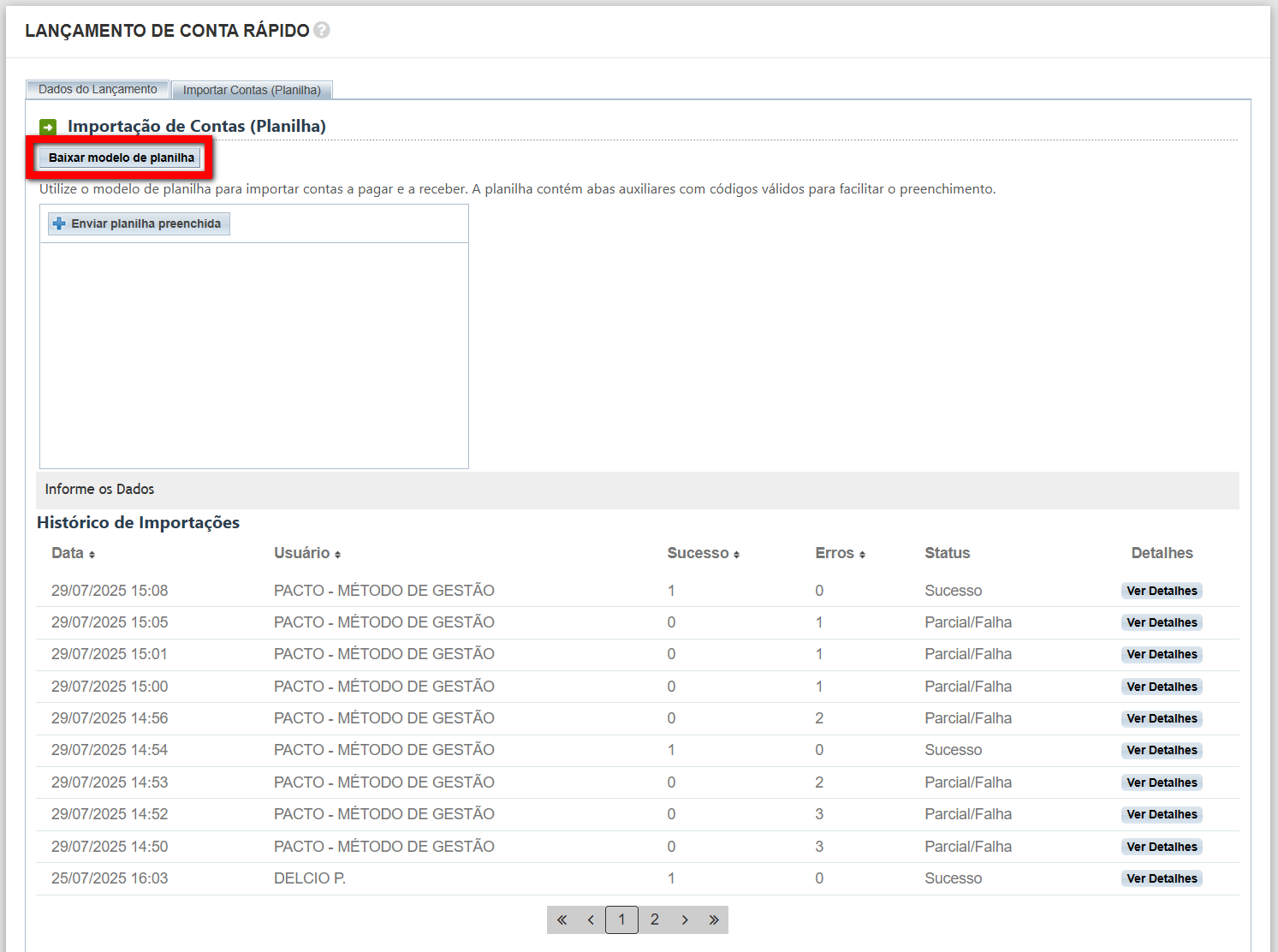 2. Na tela, clique na guia “Importar Contas (Planilha)“;