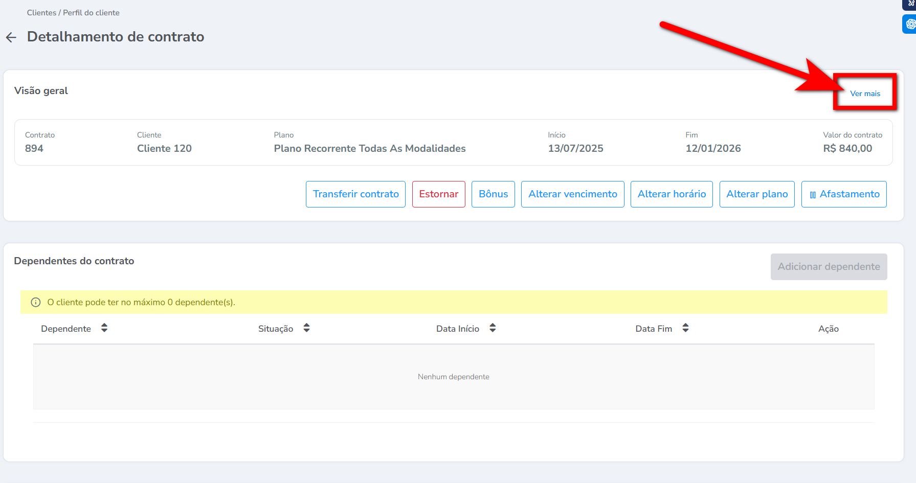 2. Na tela de Detalhamento do contrato, no bloco “Visão geral“, clique em “Ver mais“;