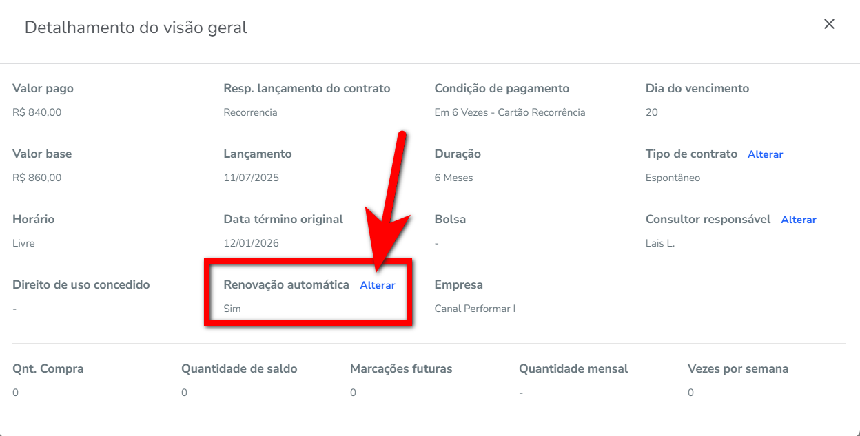 3. No detalhamento da visão geral, localize o campo de “Renovação automática” e clique em “Alterar“;
