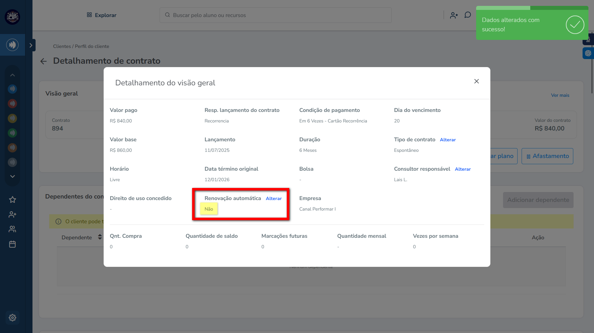 Observação: Caso precise, no futuro, retornar o plano do aluno para a renovação automática, basta seguir o mesmo passo a passo deste conhecimento e marcar a opção “Sim” na renovação. Se precisar aplicar o mesmo bloqueio para outros alunos, é só repetir o mesmo procedimento descrito aqui.