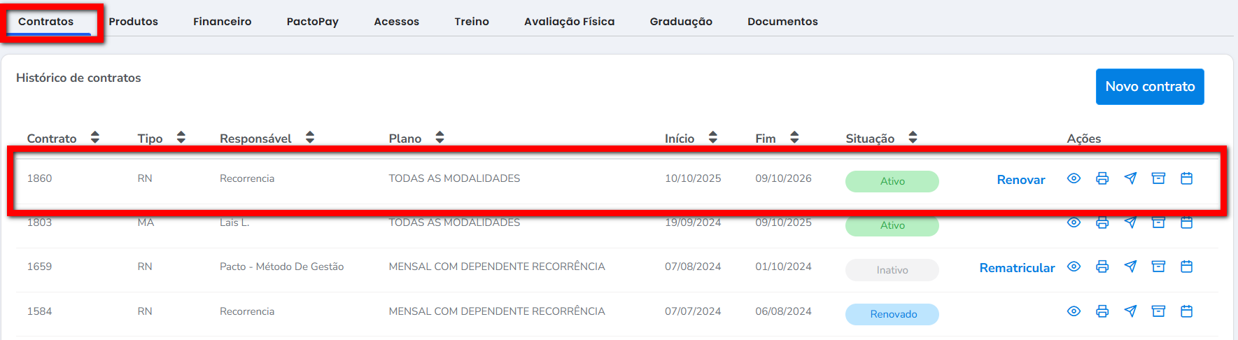 1. No perfil do aluno, na guia “Contratos” clique no contrato sobre o contrato ativo desejado;