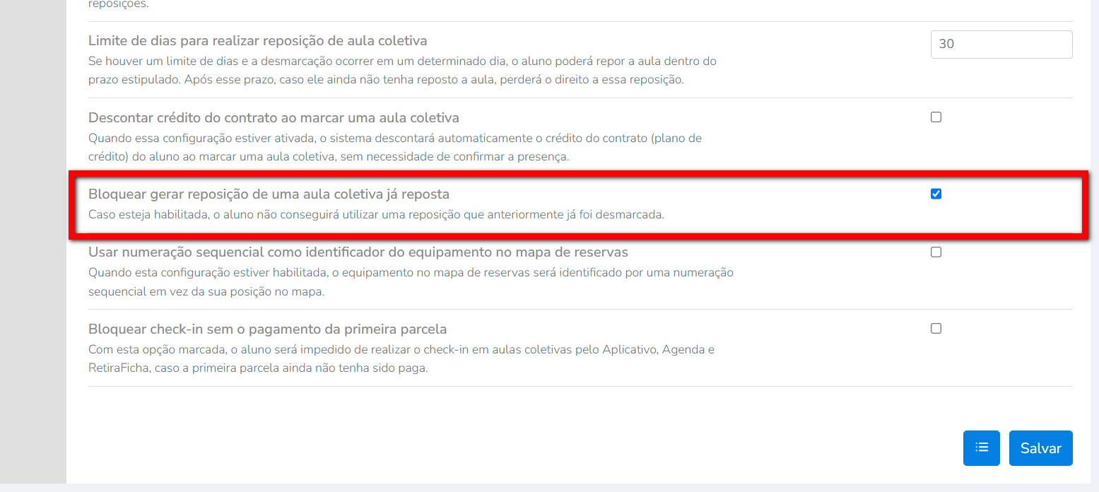 4. Habilite a configuração “Bloquear gerar reposição de uma aula coletiva já reposta“;