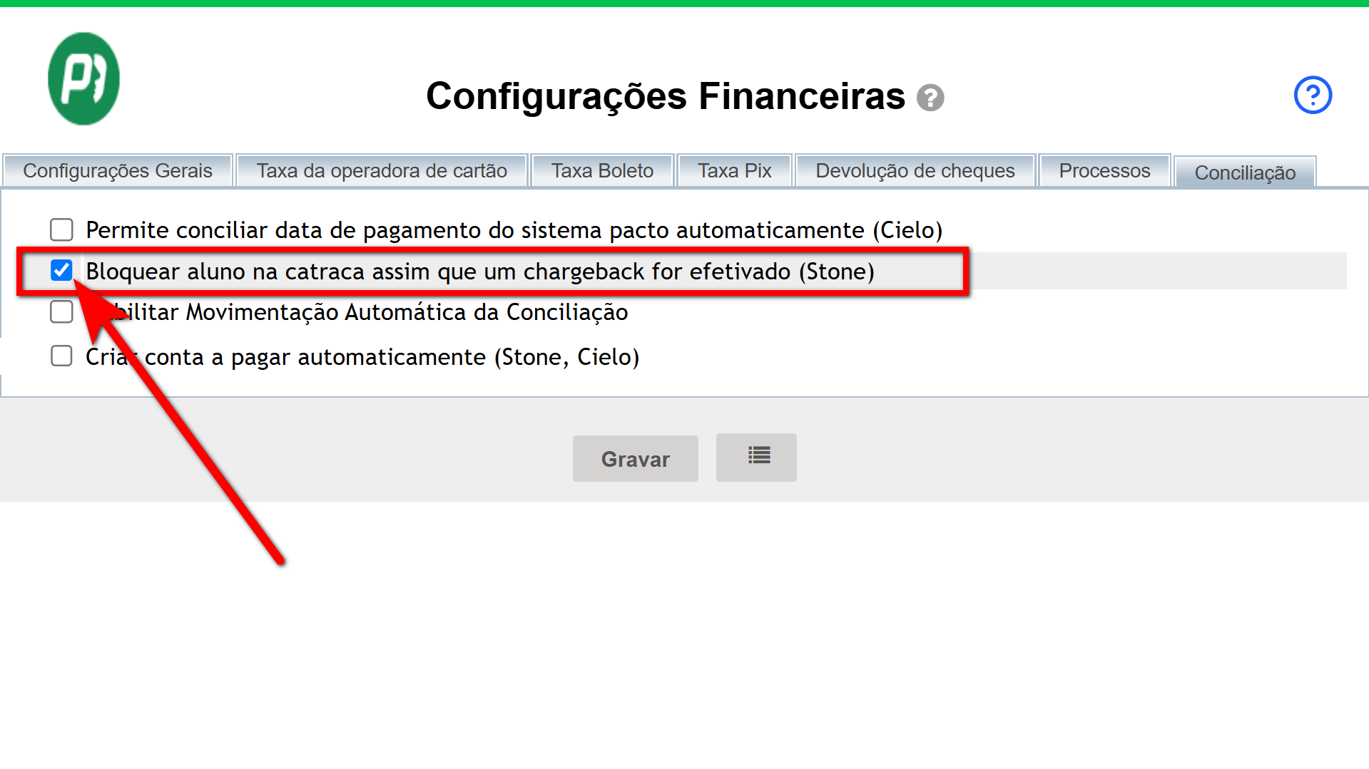 3. Na guia “Conciliação“ marque a opção “Bloquear aluno na catraca assim que um chargeback for efetivado (Stone)”;