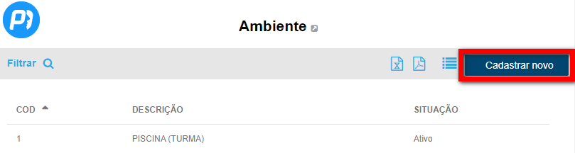 2. Nesta nova tela é apresentada uma lista com o cadastro de todos os ambientes registrados no sistema e para adicionar um novo ambiente, clique em “Cadastrar novo”;