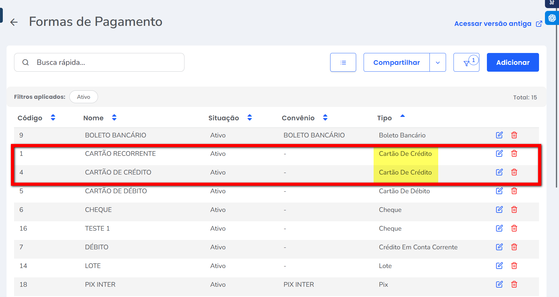 2. O sistema abrirá uma nova guia com as formas de pagamento cadastradas, selecione a forma de pagamento do cartão na qual deseja incluir as taxas;