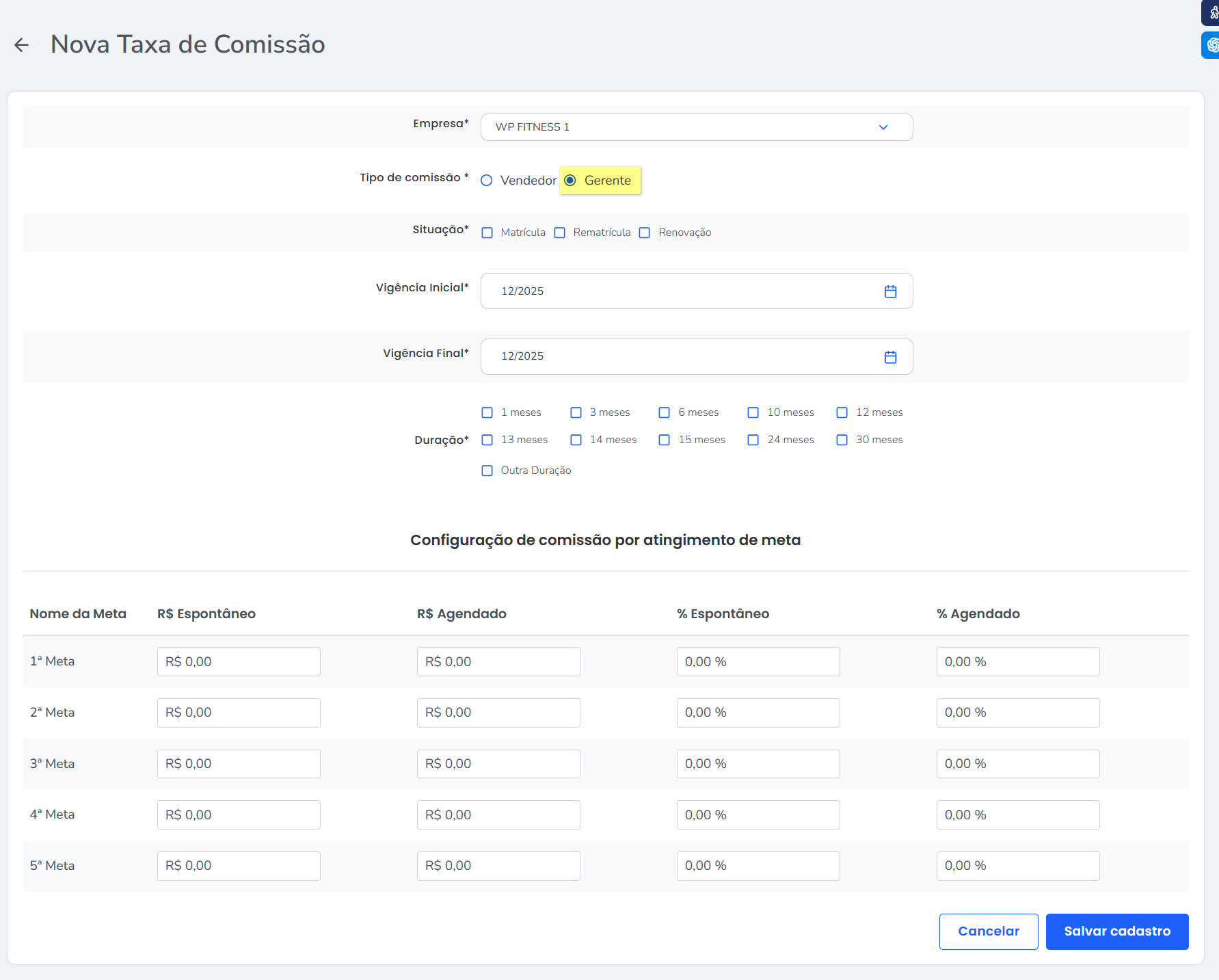 No cadastro das Taxas de Comissão, é possível registrar o percentual e o valor base que serão utilizados para calcular as comissões dos Gerentes.