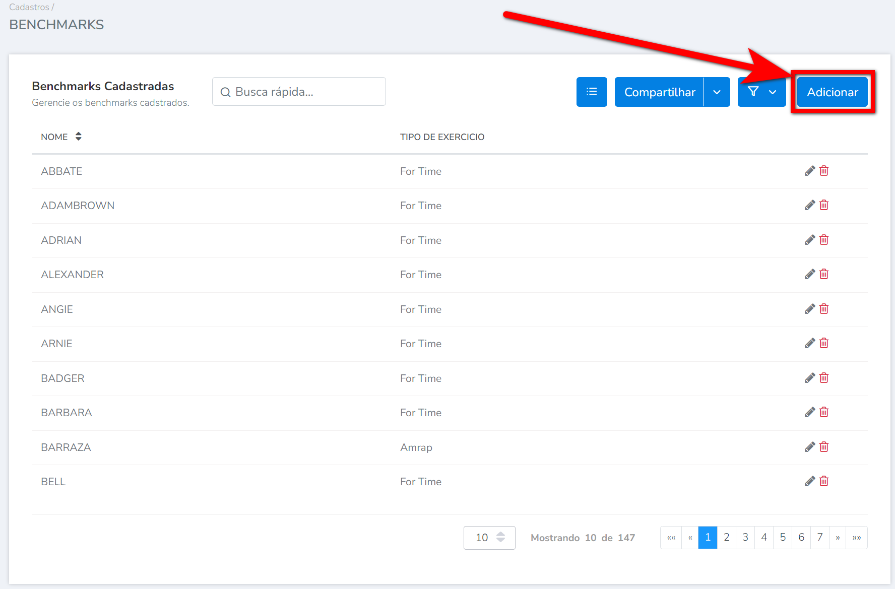 3. Será apresentado uma nova tela exibindo todos os cadastros de Benchmarks. Para cadastrar um novo, clique em “Adicionar“;