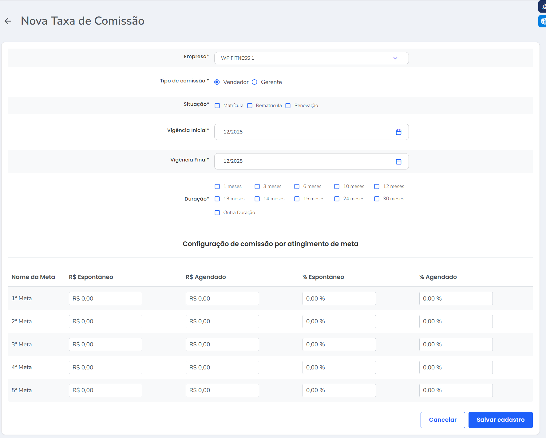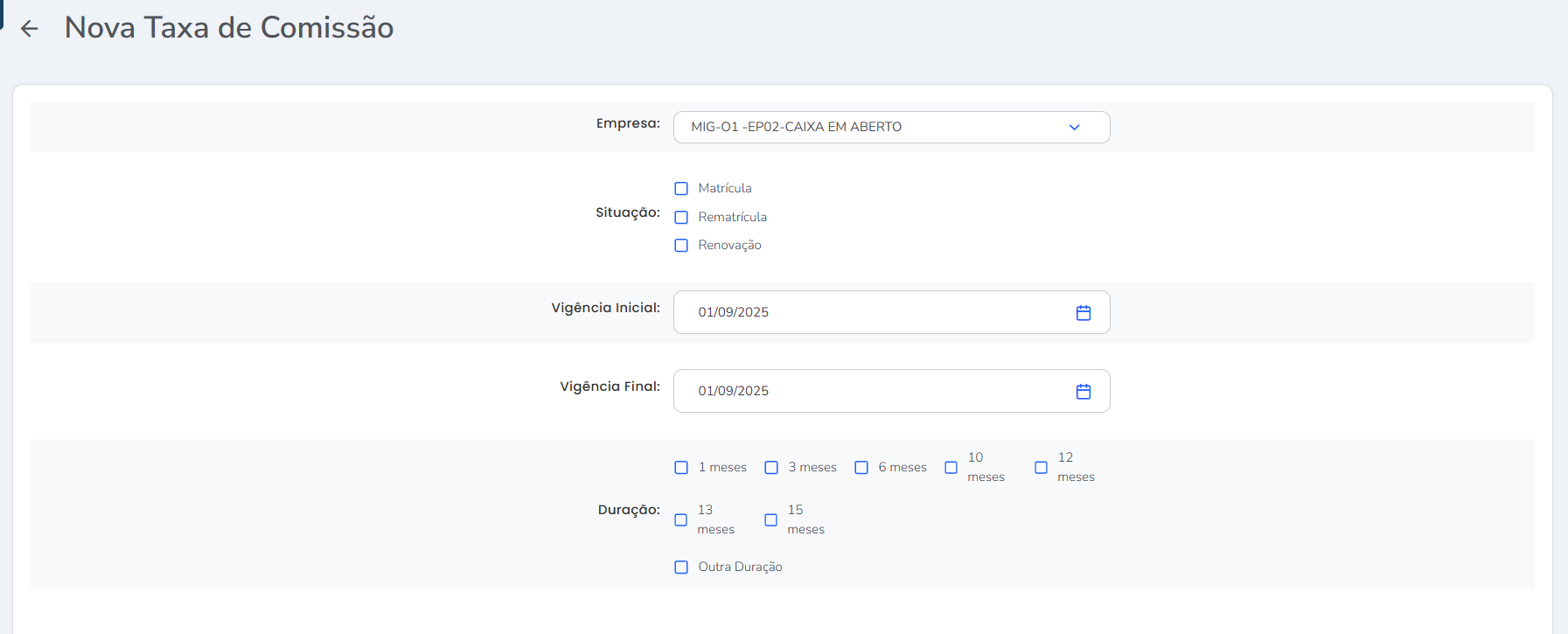 • Empresa: selecione para qual empresa será a taxa de comissão cadastrada;