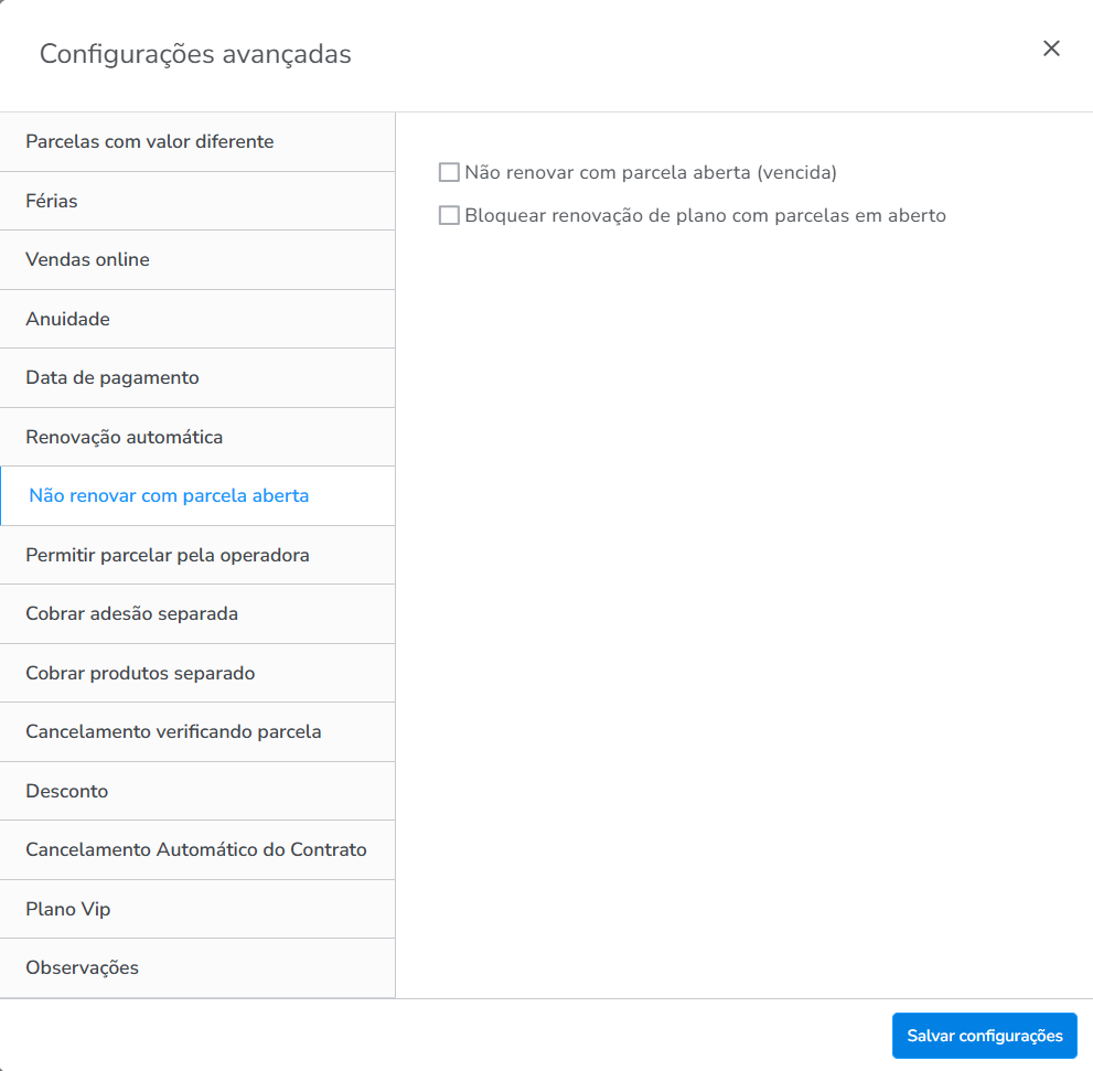 - Bloquear renovação de plano com parcelas em aberto: marque esta configuração para que o sistema não permita a renovação do plano caso o aluno tenha pelo menos uma parcela em aberto (independente da data de vencimento da parcela).