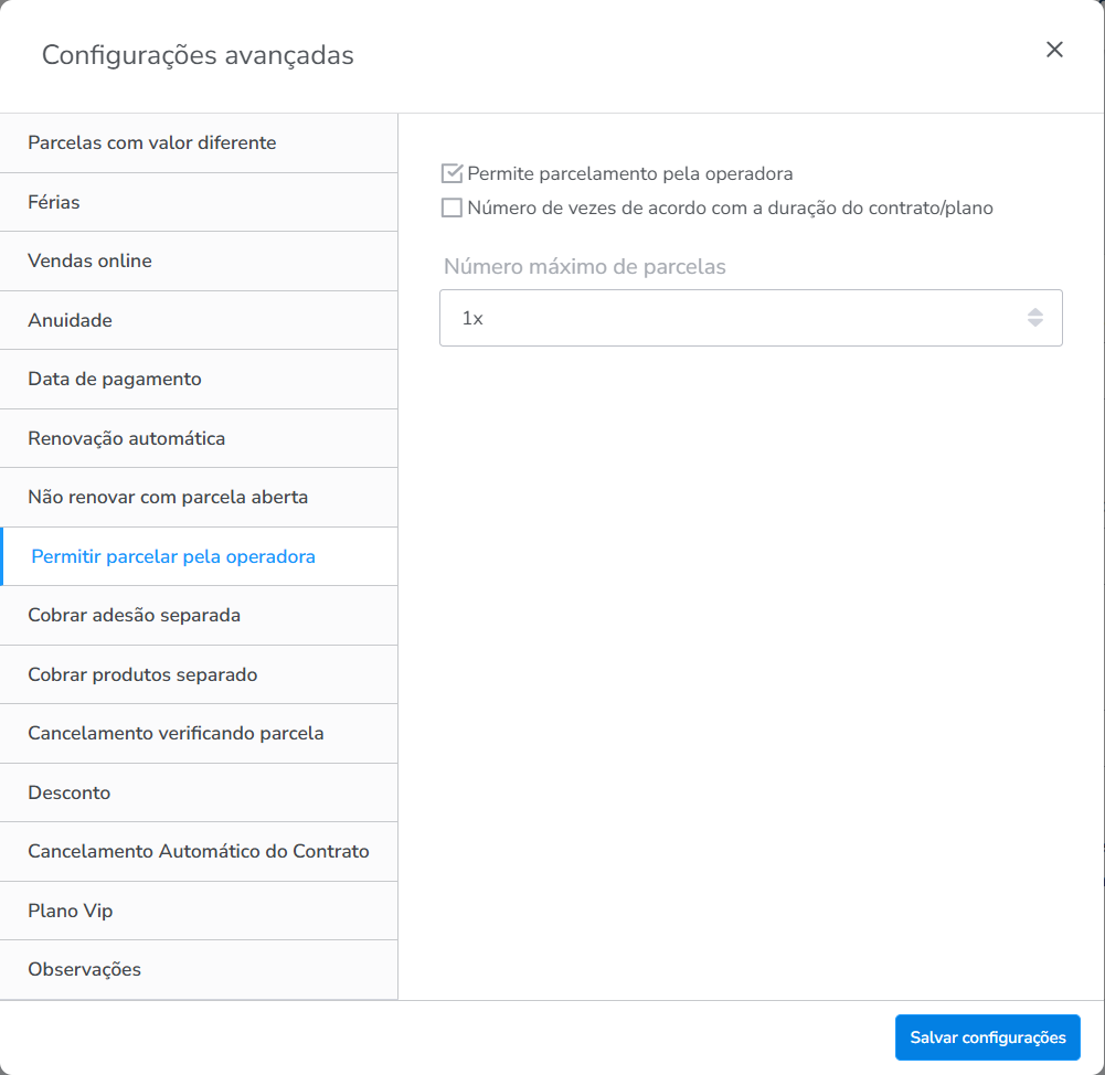 - Permite parcelamento pela operadora: marque essa configuração caso deseje que seja cobrado, de forma on-line, o valor total do plano vendido, dividido pelo número total de parcelas definido na configuração “Número máximo de parcelas”;