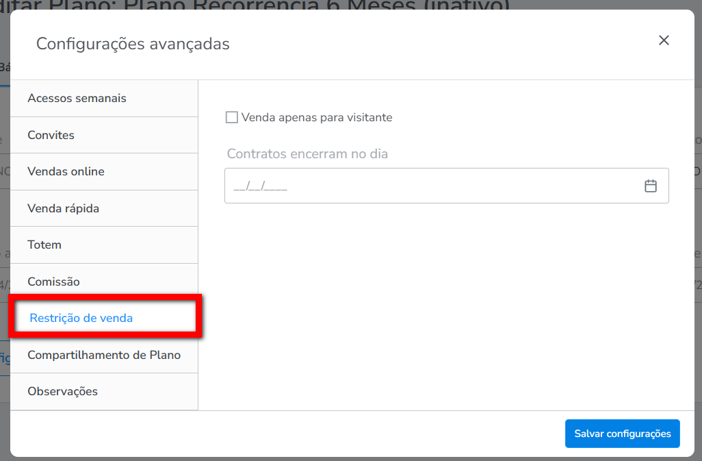 Por exemplo: se um visitante (cliente sem plano ativo) tentar comprar um plano e a opção “Venda apenas para visitante” estiver marcada, o sistema permitirá a venda. No entanto, se um cliente com plano anterior tentar fazer a compra, o sistema bloqueará a transação. - Contratos encerram no dia: ao definir uma data nesse campo, o contrato do aluno será encerrado nessa data, independentemente da data de adesão ao plano. Ou seja, o sistema ajustará o fim do contrato para a data definida, sem considerar o tempo restante do plano.
