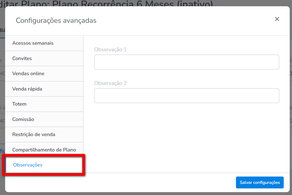 - Observações: essa opção será os campos de observações de texto livre, permitindo que o gestor registre informações importantes e específicas para cada plano, como condições comerciais, instruções internas, detalhes personalizados, entre outras.